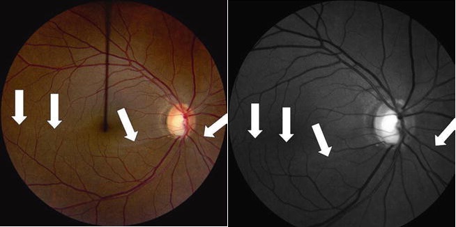 이를 RNFL 전용 Red free photo를 찍으면, 정상적인 망막색소와 잘대비되어,