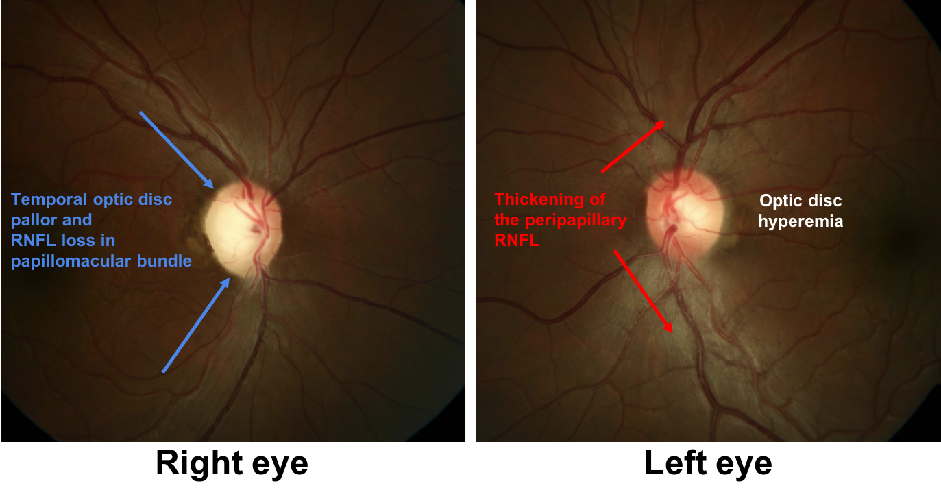 시신경 위축이 양안에서 차이가 저명하게 나고, 환자가 극심한 두통이나, 두통이외의 다른 신경학적인 증상이 있는 경우,