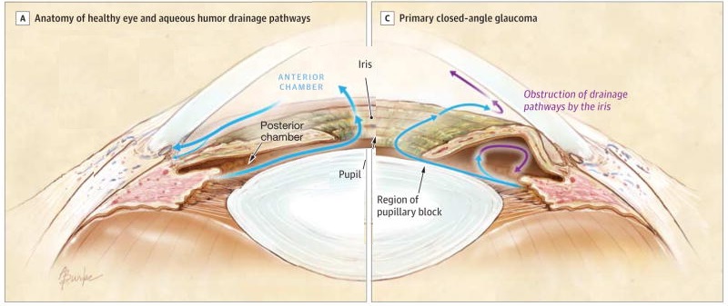 전방각이 폐쇄되어(angle closure), 방수유출이 안되어서 안압이 오르는 것입니다.