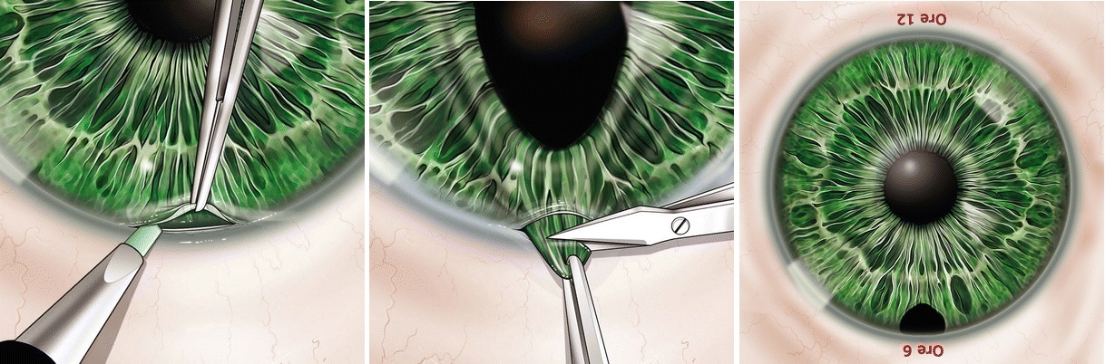 주변부 홍채를 잡아당겨, 일부를 절제해줍니다.