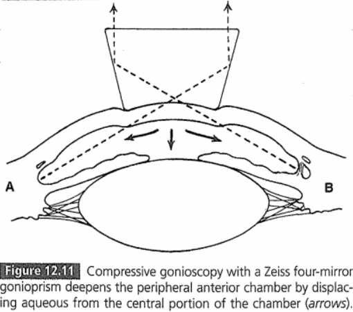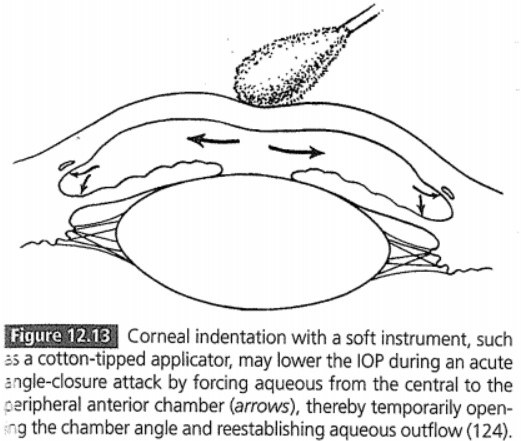 각막의 중심부를 눌러서, 전방수를 주변부로 이동시켜, 주변부 전방을 인위적으로 깊게 만드는 방법입니다.