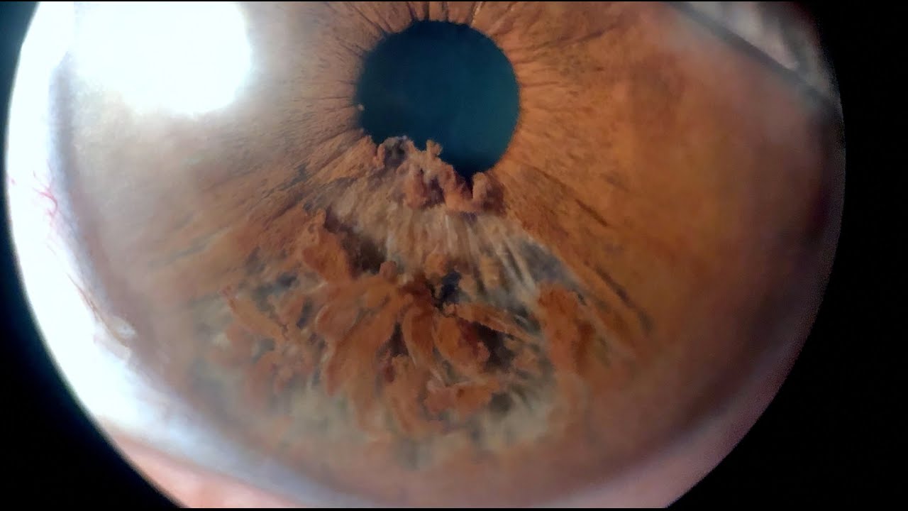 홍채 실질의 양측성 분리가 특징적인 소견이며, 하반부에서 흔하게 발생합니다.