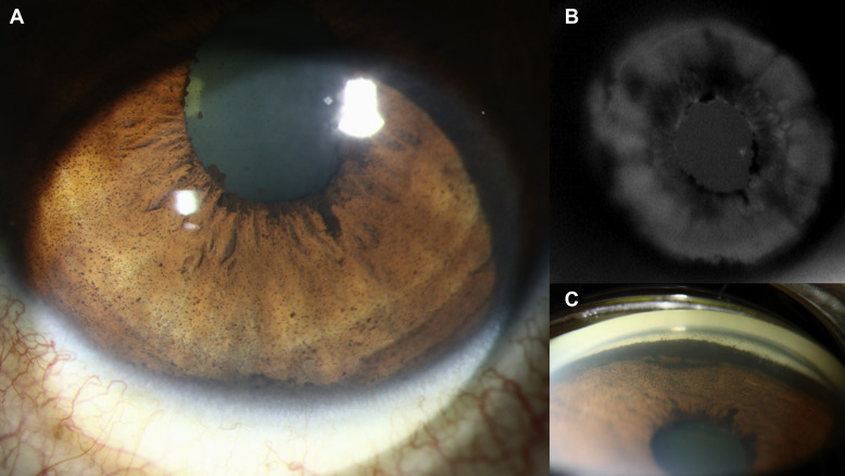 원인 미상으로, 홍채의 뒷부분과 같은 짙은 색소들이 전방에 퍼지는 상태를 의미하는데,