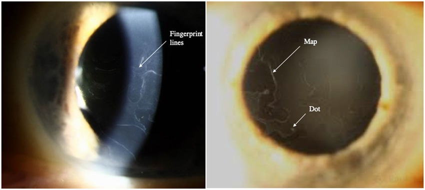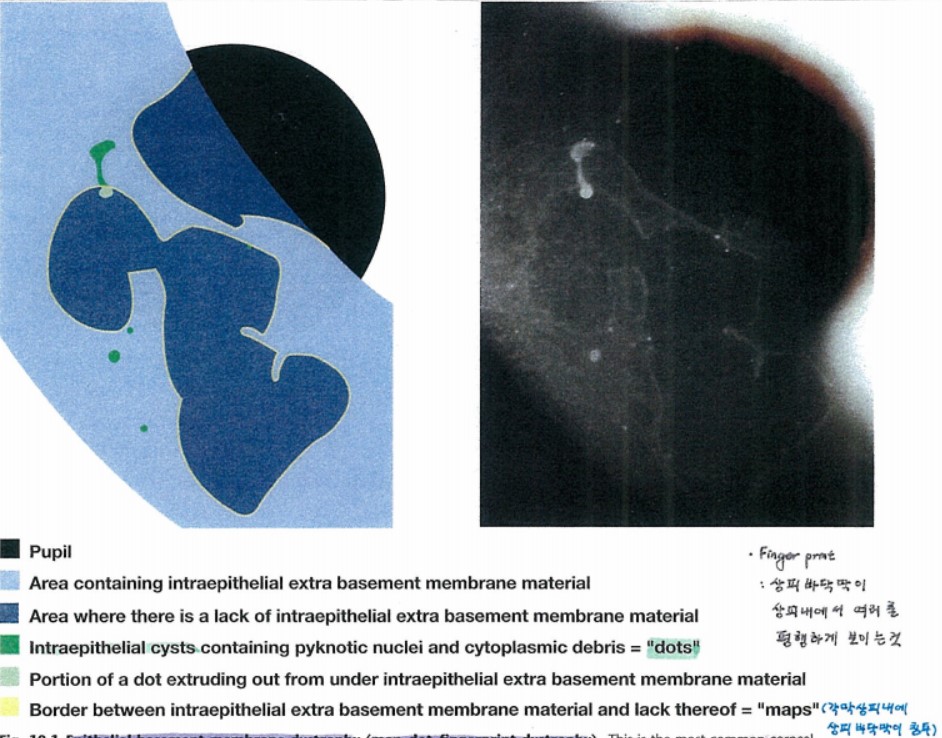 이처럼 map, dot, finger print 의 형태로 보이기에 map dot finger print dystrophy 라고 합니다.