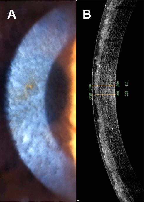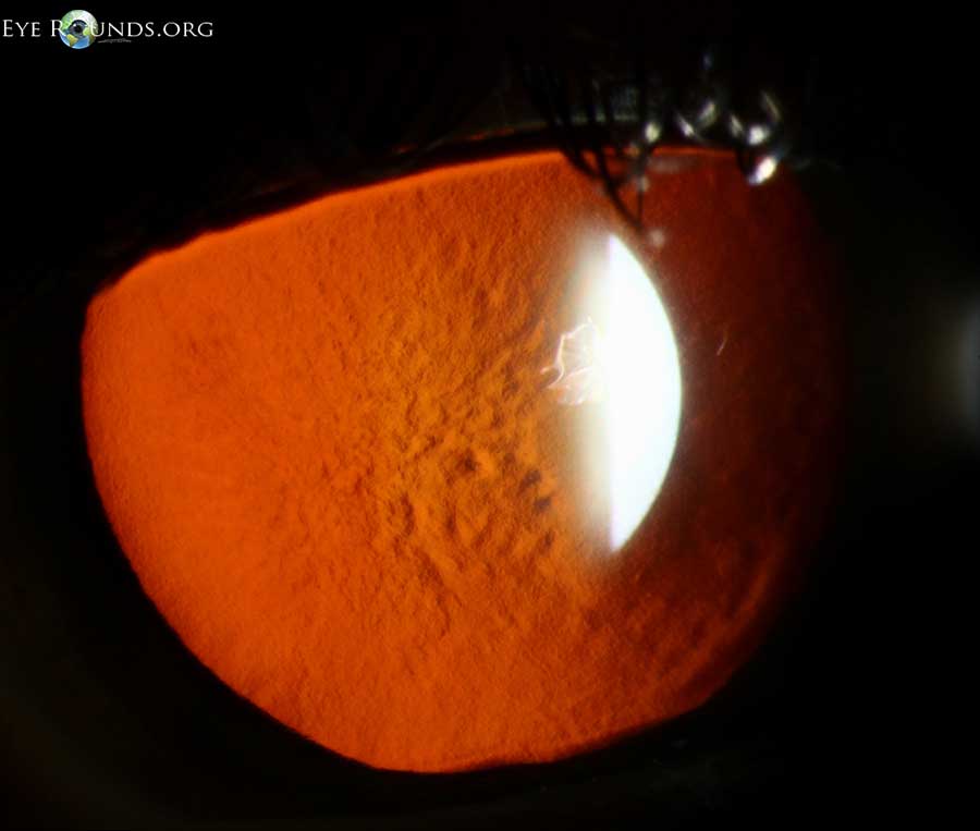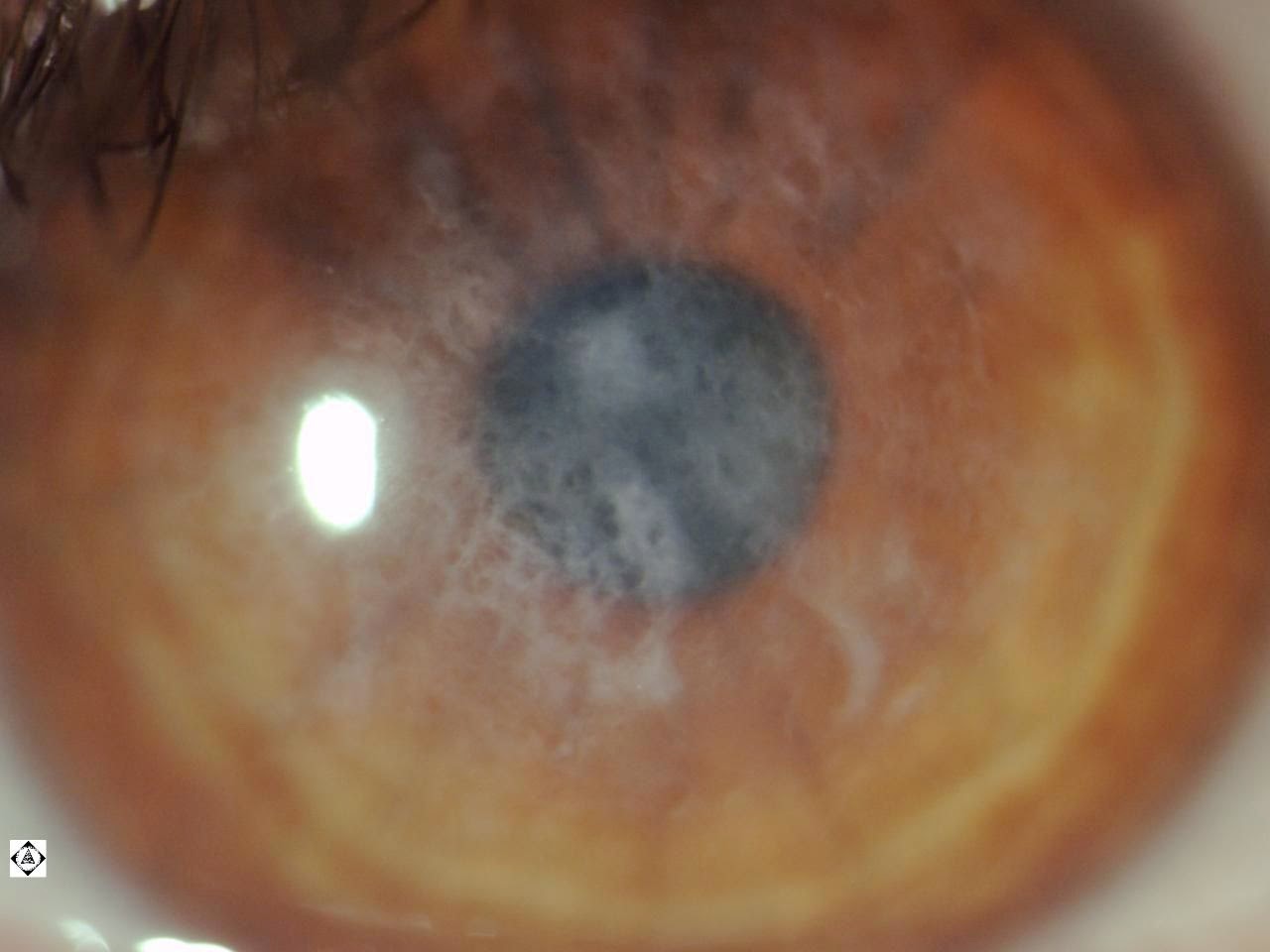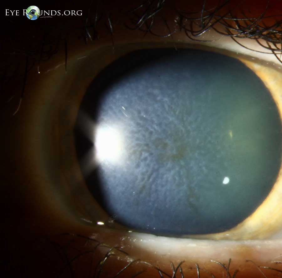 후기에는 중심부 혼탁이 그물모양으로 변하며, 주변부에는 각막기질의 상측에 혼탁이 존재합니다.