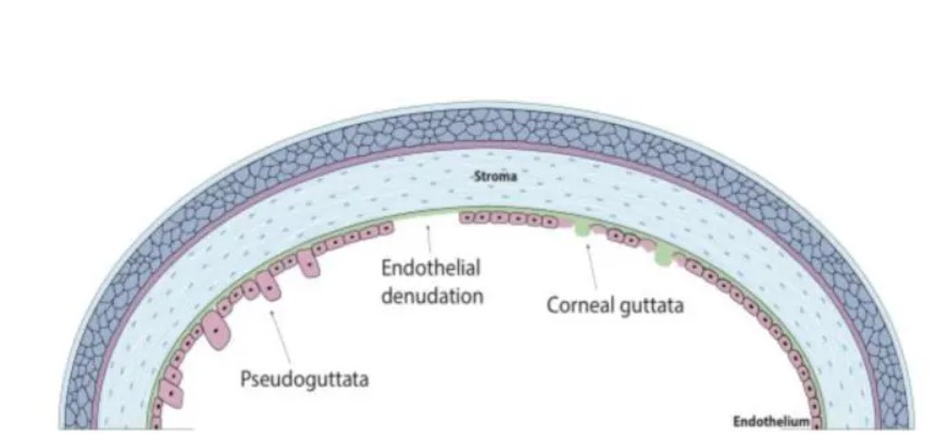 각막 내피 에서포 구타타, guttata 라고하는 방울 모양이 발생하면서,