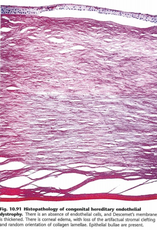 내피세포가 없으며, 데스메막이 두꺼워져 있으며, 각막기질의 부종 및 상피부종이 관찰됩니다.