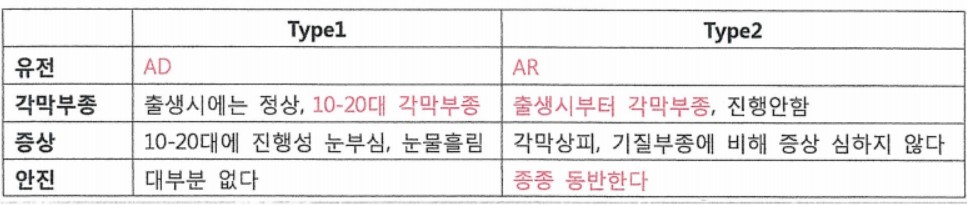 증상은 경미한편이나, 각막 혼탁이 이른시기부터 발생하게되어 시력은 좋지 못합니다.