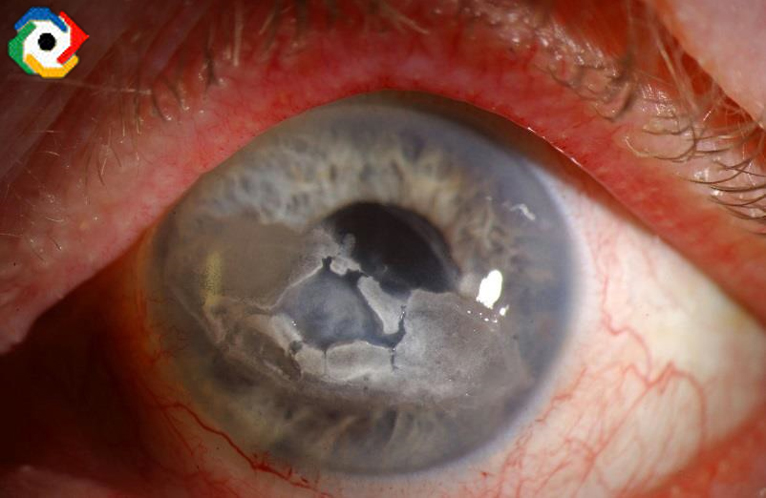 눈물에서부터의 칼슘이 각막에 침착되는 형태입니다.