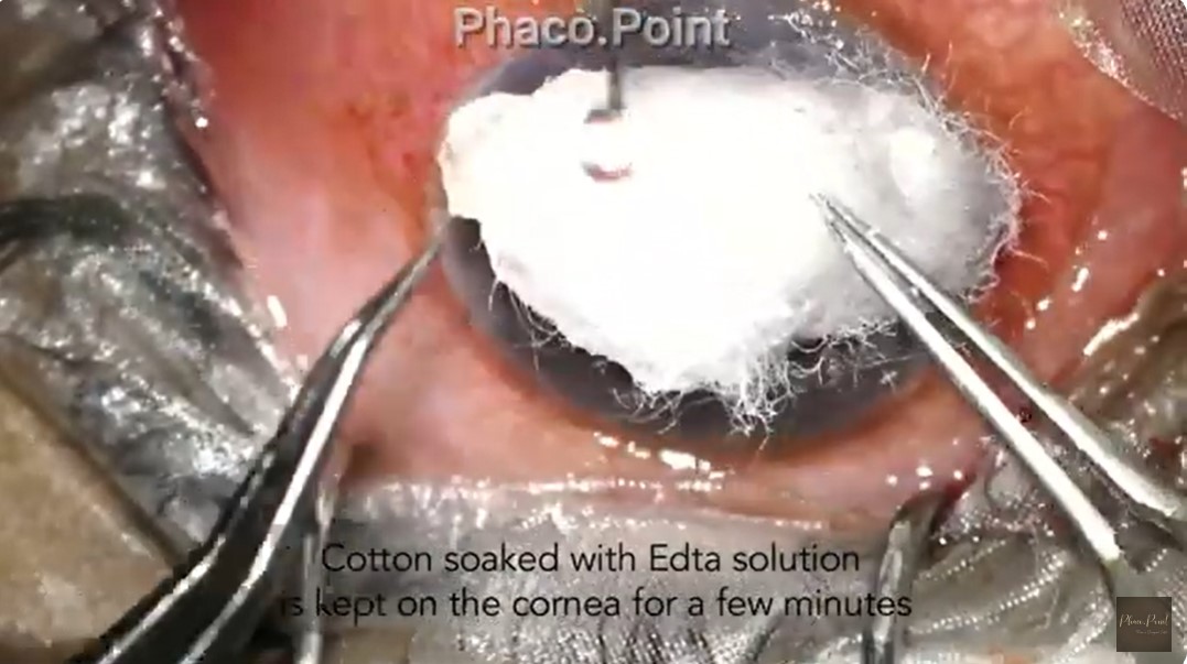상피를 제거하고난뒤 1~2% EDTA용액은 2분간 점적한뒤, 15번 블레이드를 이용하여, 표면이 매끈해질때까지 벗겨냅니다.