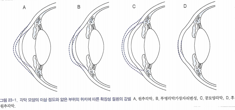 각막의 후층에서부터 부터 얇아지면서 전층이 얇아지고 각막이 앞쪽으로 돌출되는 양상입니다.