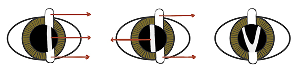 눈의 도수를 측정하기위한 검영법을 시행하였을때 눈에서 관찰되는 적색반사가 불규칙적이게되면서,