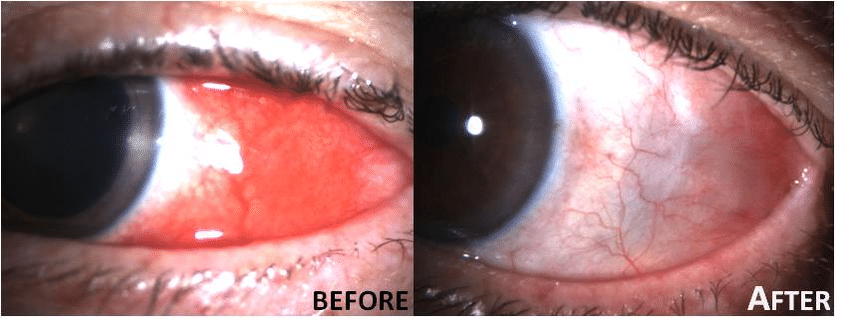 이 에 따라서, 초기부터 결막 아래 조직으로의 침범이 흔하며,