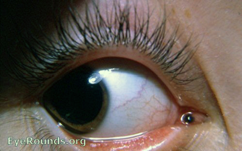 형태는 편평하거나 융기된 갈색반으로, 안구의 표면에서 쉽게 움직여집니다.