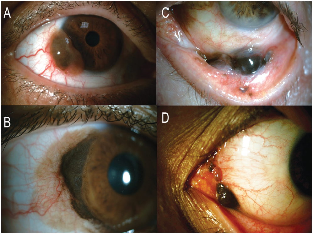 이측 및 하측의 사분면의 안구 결막에서 호발합니다.