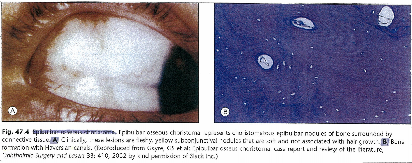 안구의 결막에 발생하는 골성(뼈조직) 조직, 뼈의 성분이 침착되는 종양입니다.
