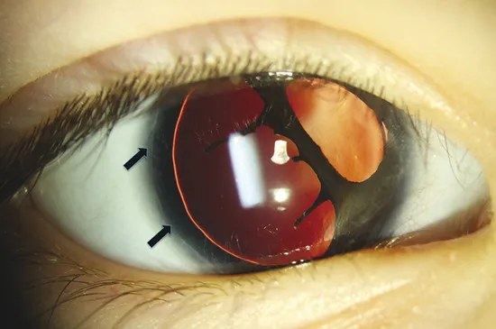 이때는 홍채 실질의 이상이 동반되어, 동공의 편위, 가성 동공증이 발생할수 있습니다.