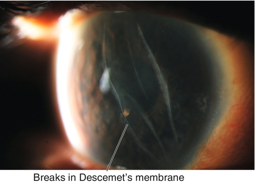 각막의 데스메막, 내피세포 등이 압박에 의해서 파열되면서 발생하게되며,