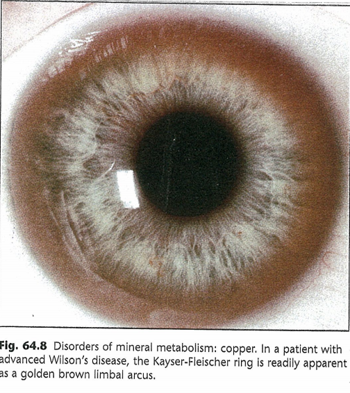 더 진행된 윌슨 병에서는 구리의 침착으로 인해 전형적인 golden brown limbus arcus , 즉 구리의 침착이 윤부에 나타납니다.