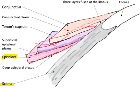 sclera 위 (epi) 에 있다고 하여 episclera 라고 하는 조직으로,