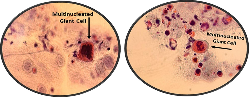 수포를 이용한 챙크 Tzanck 도말 검사에서는 다핵거대세포(giant multinucleated cells) 관찰이 가능한데,