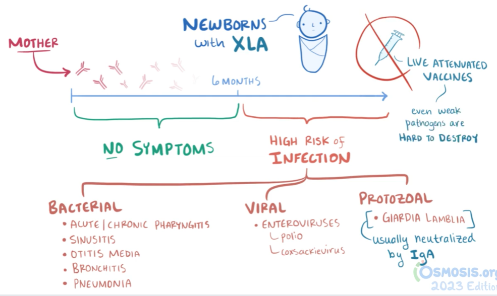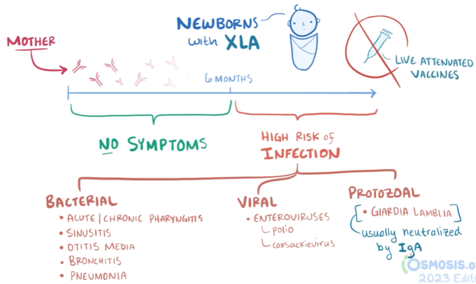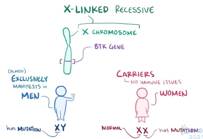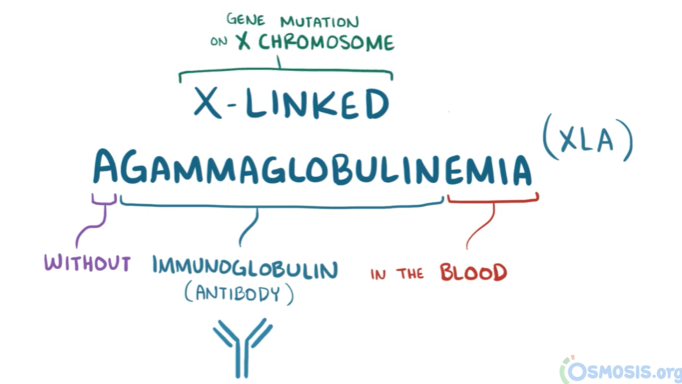 또한 X-linked 즉 X 성염색체 관련 유전이 가장 흔하기에 X-linked agammaglobulinemia (XLA) 혹은