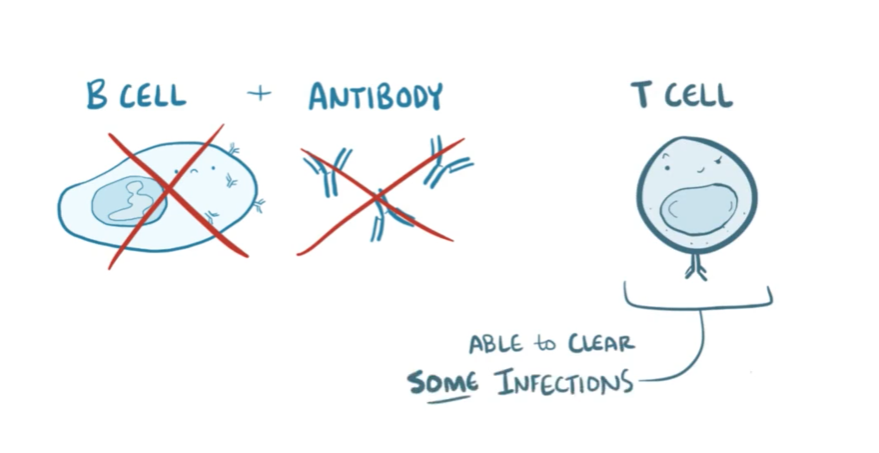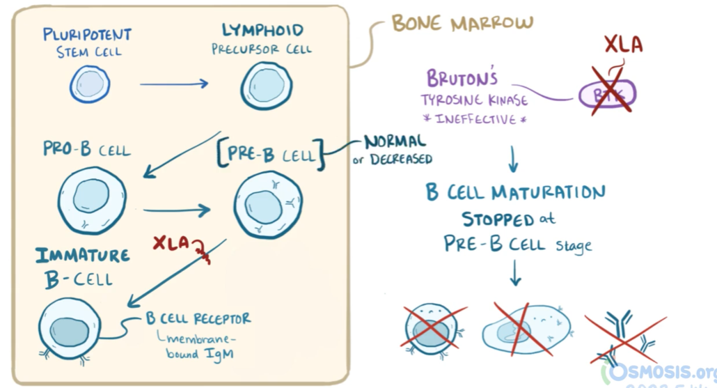 pre-B cell이 성숙한 B 림프구(B lymphocyte)로 분화하지 못하여 항체 생성이 불가능해 지는것이 핵심 병리입니다.