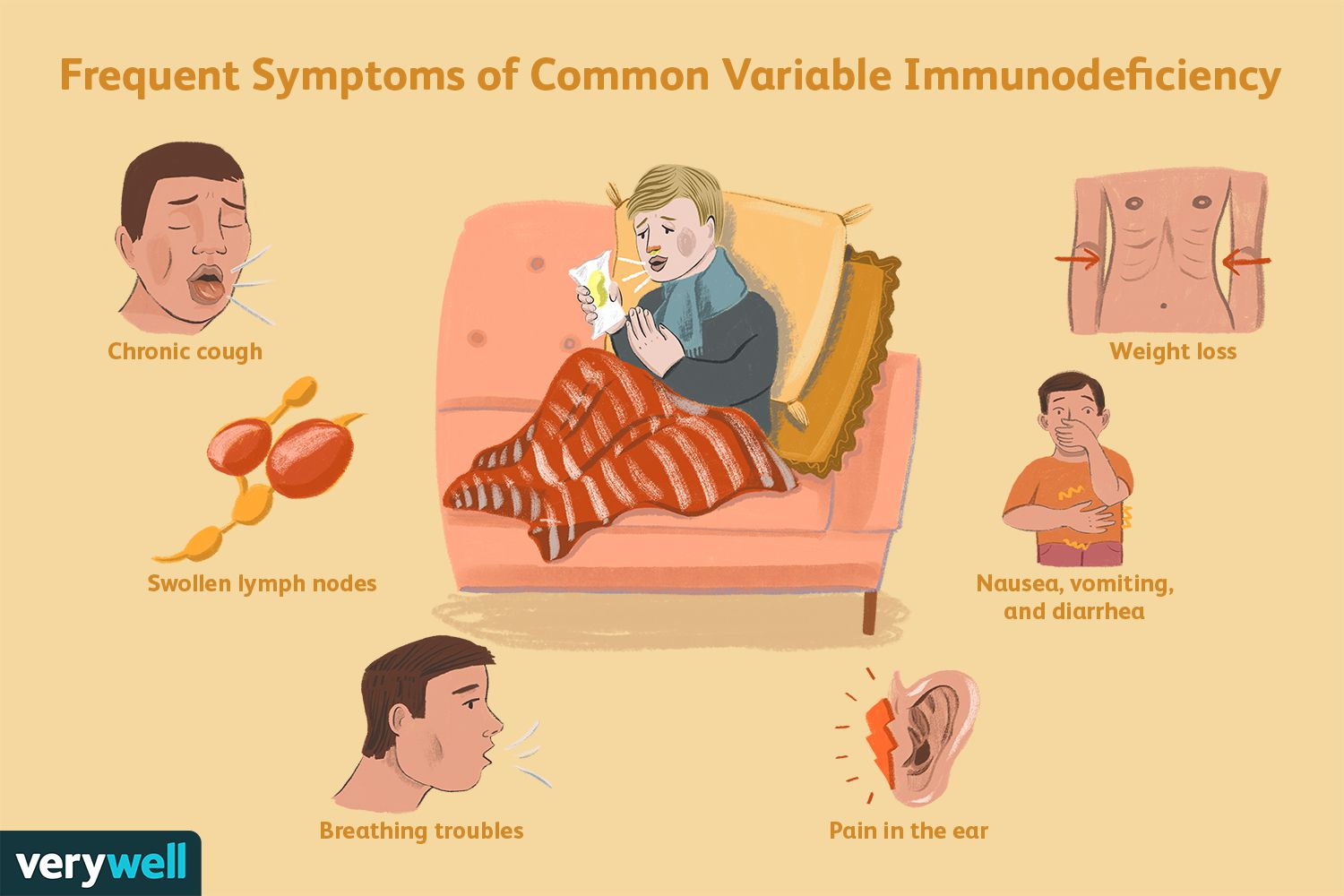 감염 증상은 대개 상기도 감염이나 위장관 감염이 반복되는 형태입니다.