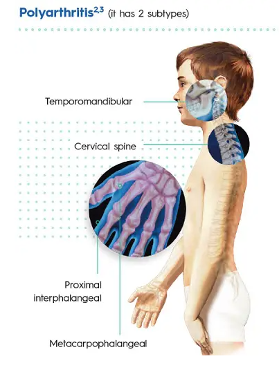 다수관절형 (Polyarticular type, Polyarthritis)은 5개 이상의 관절 침범하는 경우로