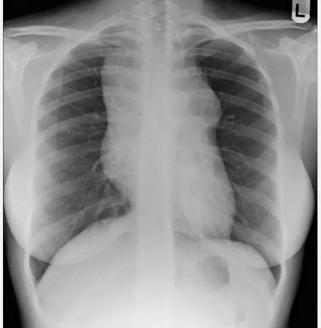 이후 흉부 X-ray 를 촬영하여 경부 림프절 종대 환자에서 종격동 림프절 비대를 확인하는데,