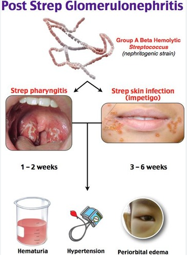 PSGN은 A군 β-용혈성(beta hemolytic) 사슬알균(streptococcus) 감염 후