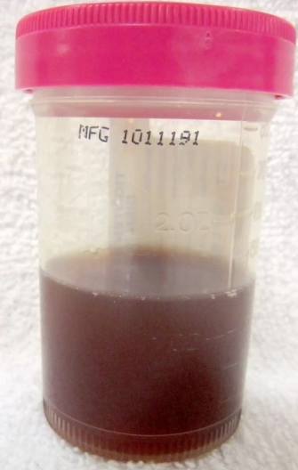 혈뇨는 수일간 지속되는 적갈색 소변형태로 발생합니다.