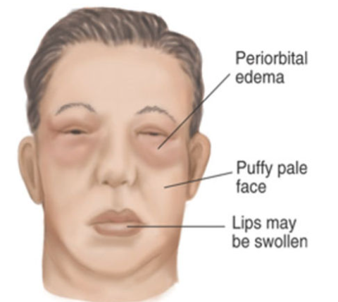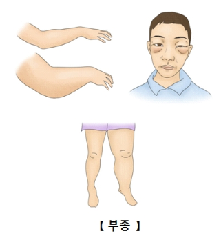전신부종이 특히 안면 및 눈 주위에서 시작 하여 전신으로 확산 하게됩니다.