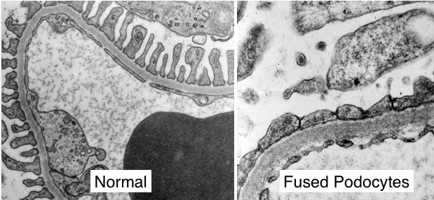 EM (전자현미경)에서는 podocyte foot process의 미만성 융합 (유일하고 특징적인 소견)