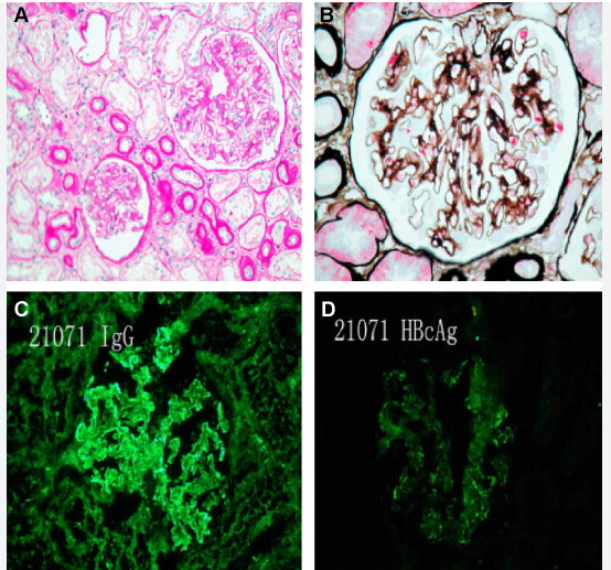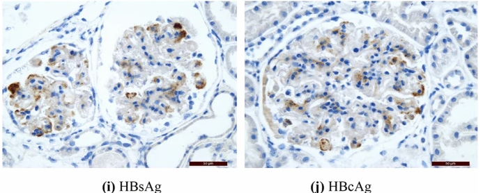 병리 소견에서 HBsAg, HBcAg, HBeAg, HBV DNA가 사구체 병변 부위에서 발견됩니다.