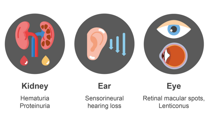 임상 증상은 신장, 청력, 안과 이상 으로 구성됩니다.