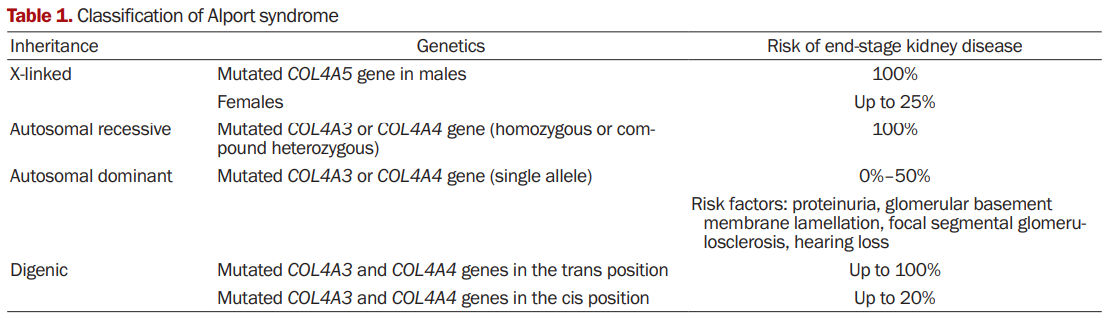 간혹 상염색체 열성으로 유전하는 경우도 있는데, 이는 COL4A3 또는 COL4A4 돌연변이와 관련있습니다.
