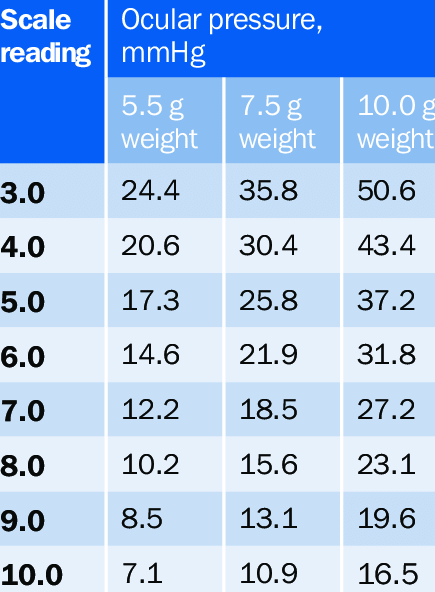 이때 눈금을 환산표를 이용해서 안압으로 변환시켜서 안압을 추정합니다.