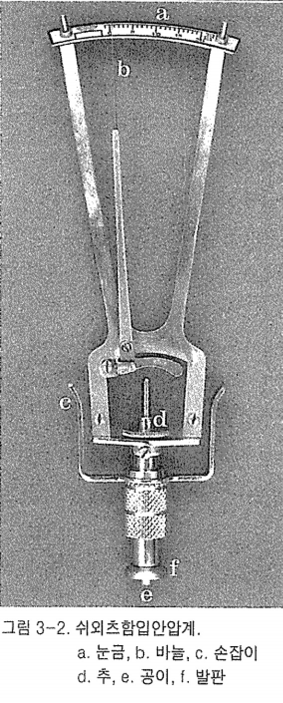 쉬외츠 안압계는 안압계에 달려 있는 공이(e) 가