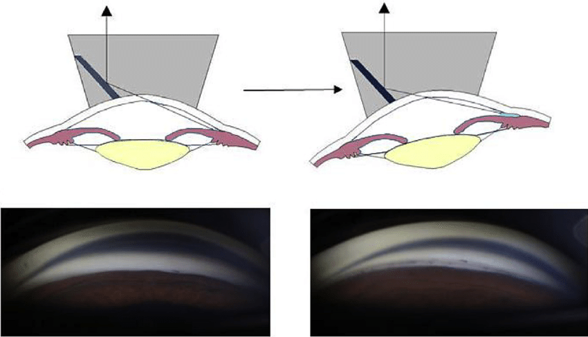 이는 환자의 홍채가 앞으로 불룩하여 전방각이 얕은 환자에서 관찰에 유용합니다.