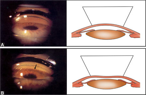 이는 환자의 홍채가 앞으로 불룩하여 전방각이 얕은 환자에서 관찰에 유용합니다.