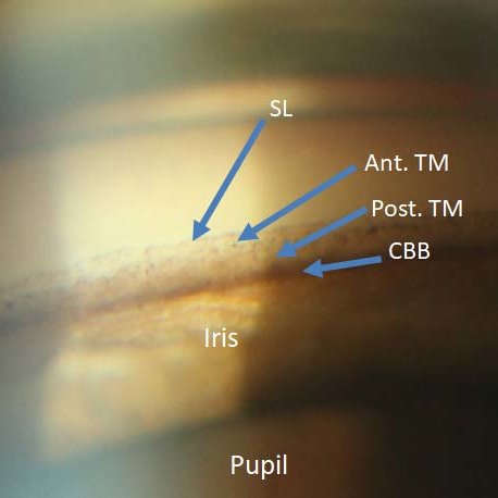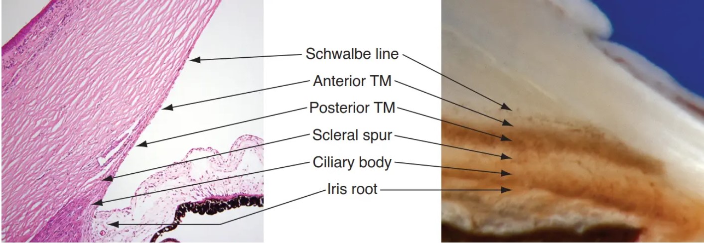 1 Iris root 2 Ciliary body 3 Scleral spur 4 Trabecular meshwork 5 Schwalbe line