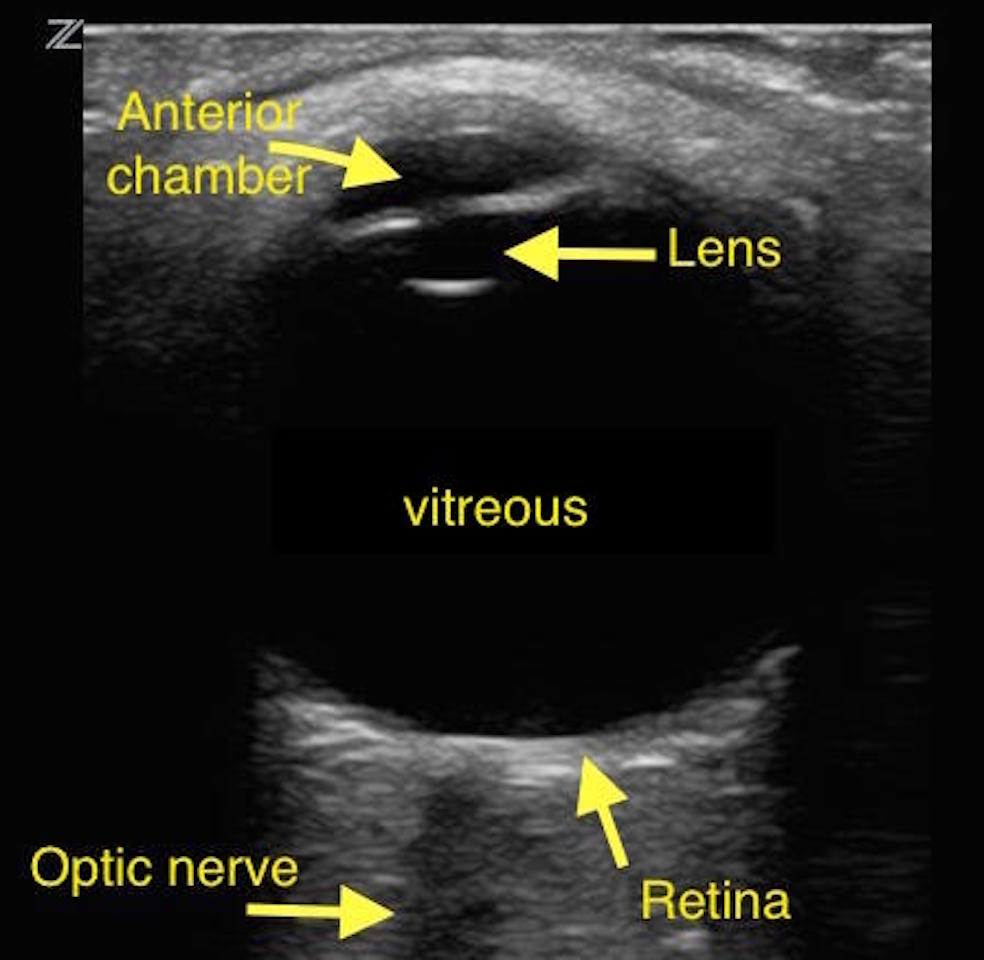 망막을 포함하는 안구의 뒷부분 및 때로는 안와의 일부를 관찰할수 있습니다.