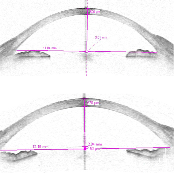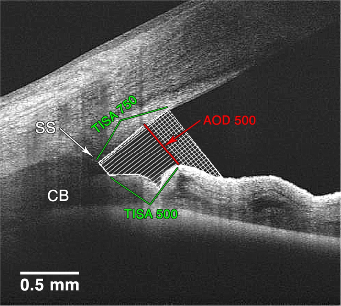공막돌기에서부터 500um(0.5mm) 떨어져져서 전방의 깊이를 측정하면 전방각이 열려있는 정도를 객관적으로 수치화하여 측정할수 있습니다.