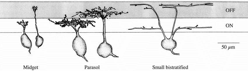 위에서 이야기한 midget cell 은 P cell 에 해당되고,