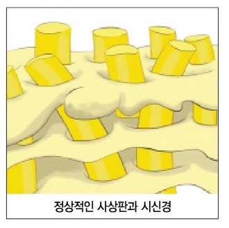 시신경을 보호하는 아교질이 적다보니, 녹내장에서 위쪽과 아래쪽의 사상판주위가 먼저 손상되는 것으로 생각되고 있습니다.