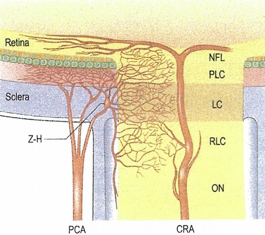 시신경 유두 주위의 둥근 혈관망인 Circle of Zinn-haller 에 의해서 공급을 받습니다.