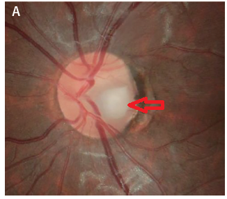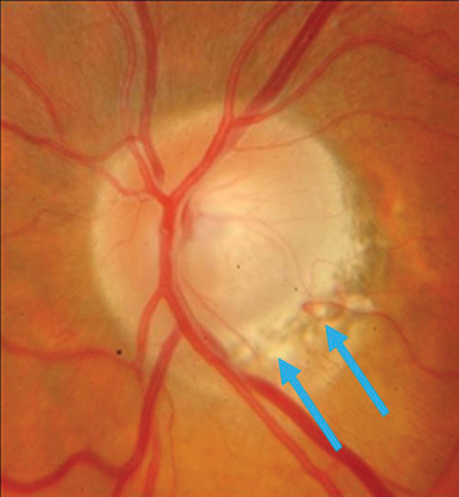 해당부위에 이전에 시신경유두의 선상출혈이 발생하였다가 출혈이 없어지고난뒤에 발견하는 경우가 종종 있습니다.