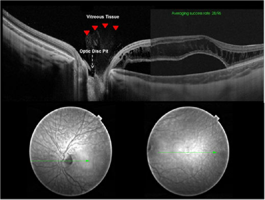Optic disc에 발생하는 구덩이 Pit 이 선천적으로 태어날때부터 가지는 경우가 있습니다.