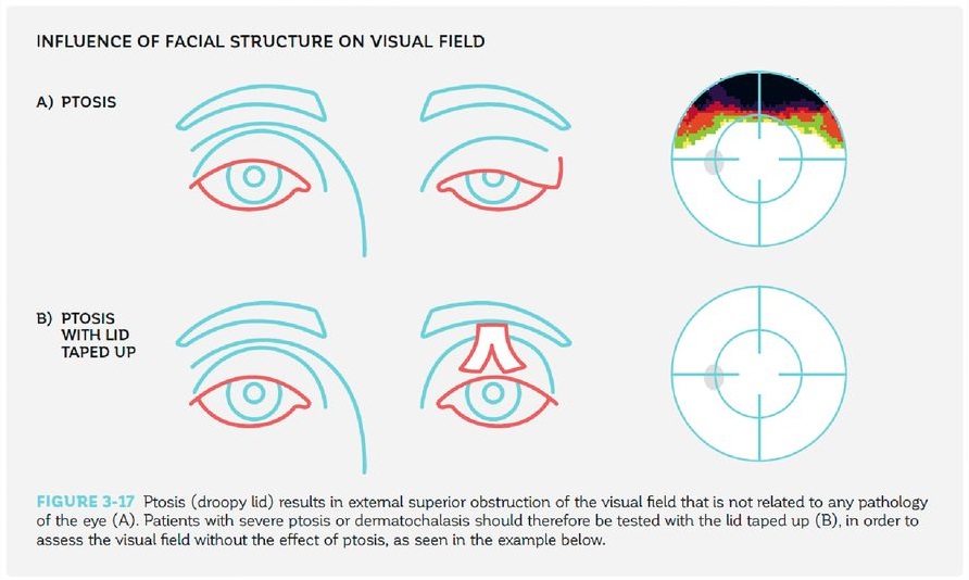눈꺼풀 처짐이 있는 경우 마치 위쪽 시야 결손이 있는것 처럼 나타날수 있습니다
